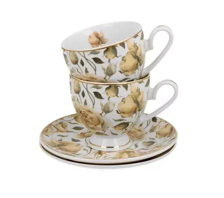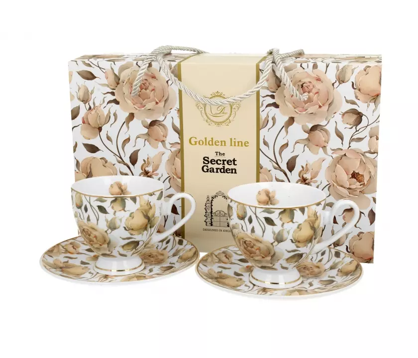 Filiżanki na prezent ENGLISH ROSES WHITE - Golden Line wchodząca w skład serii Golden Line, wykonany z porcelany New Bone China, charakteryzującej się elegancką i naturalną kremowo - białą barwą z delikatnym połyskiem, a także wyjątkową wytrzymałością.