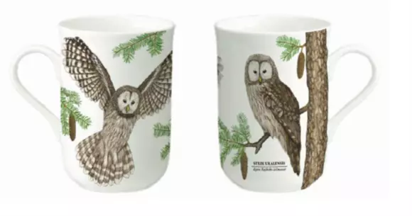 Porcelanowy duży poręczny kubek z motywem Puszczyk Uralski o klasycznym wyglądzie, z lekko zaokrąglonym spodem wykonany z dobrej jakości, białej z połyskiem porcelany kostnej. Kubek na prezent do herbaty i kawy.