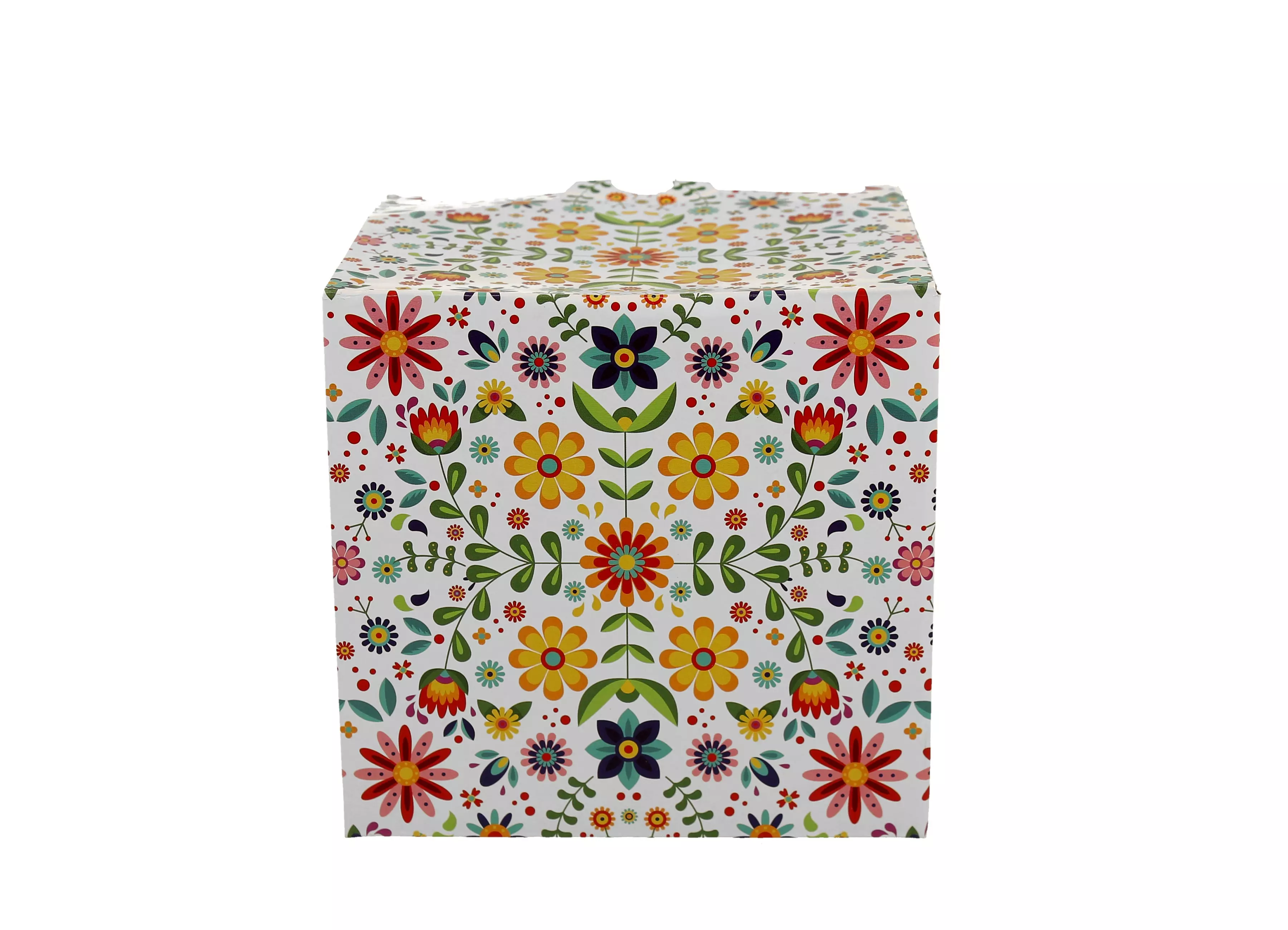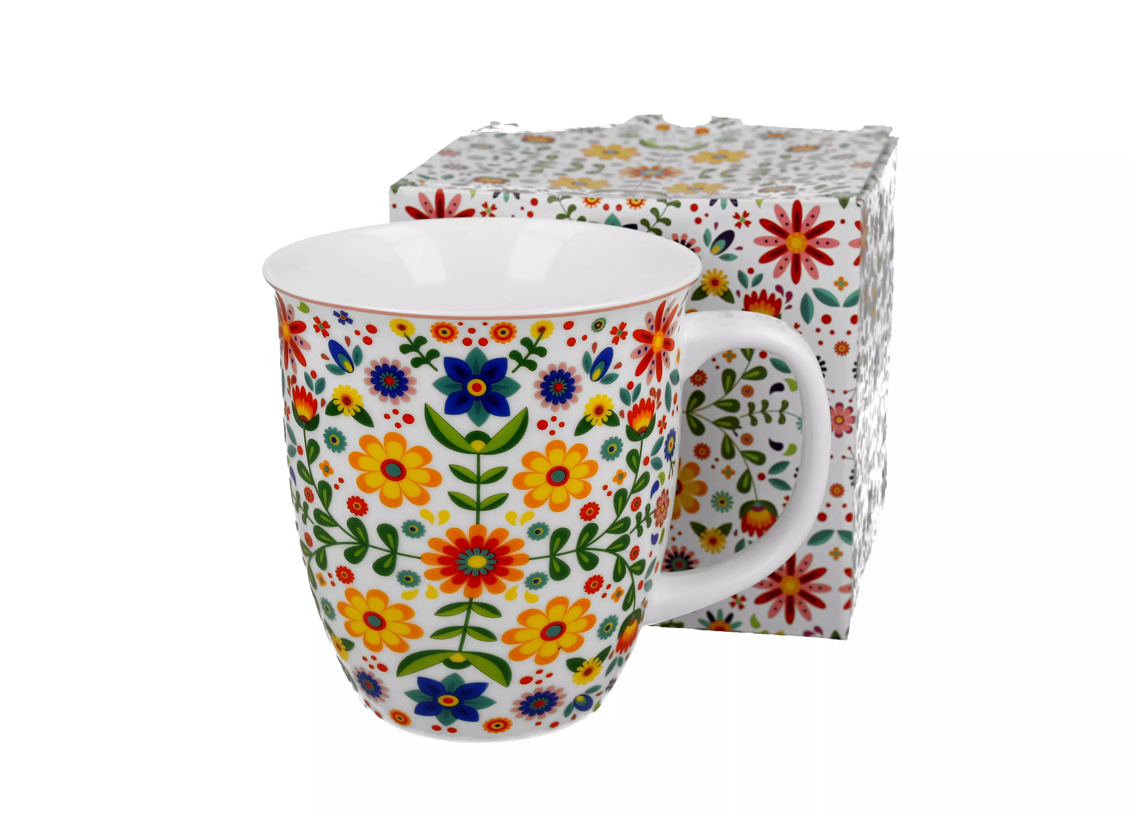 Kubek 650 ml z malowanymi kolorowymi kwiatkami na białym tle. Wykonany z porcelany New Bone China, która charakteryzuje się naturalnym kremowo-białym kolorem z delikatnym połyskiem oraz wyjątkową wytrzymałością i trwałością, zachowując lekkość i finezję.