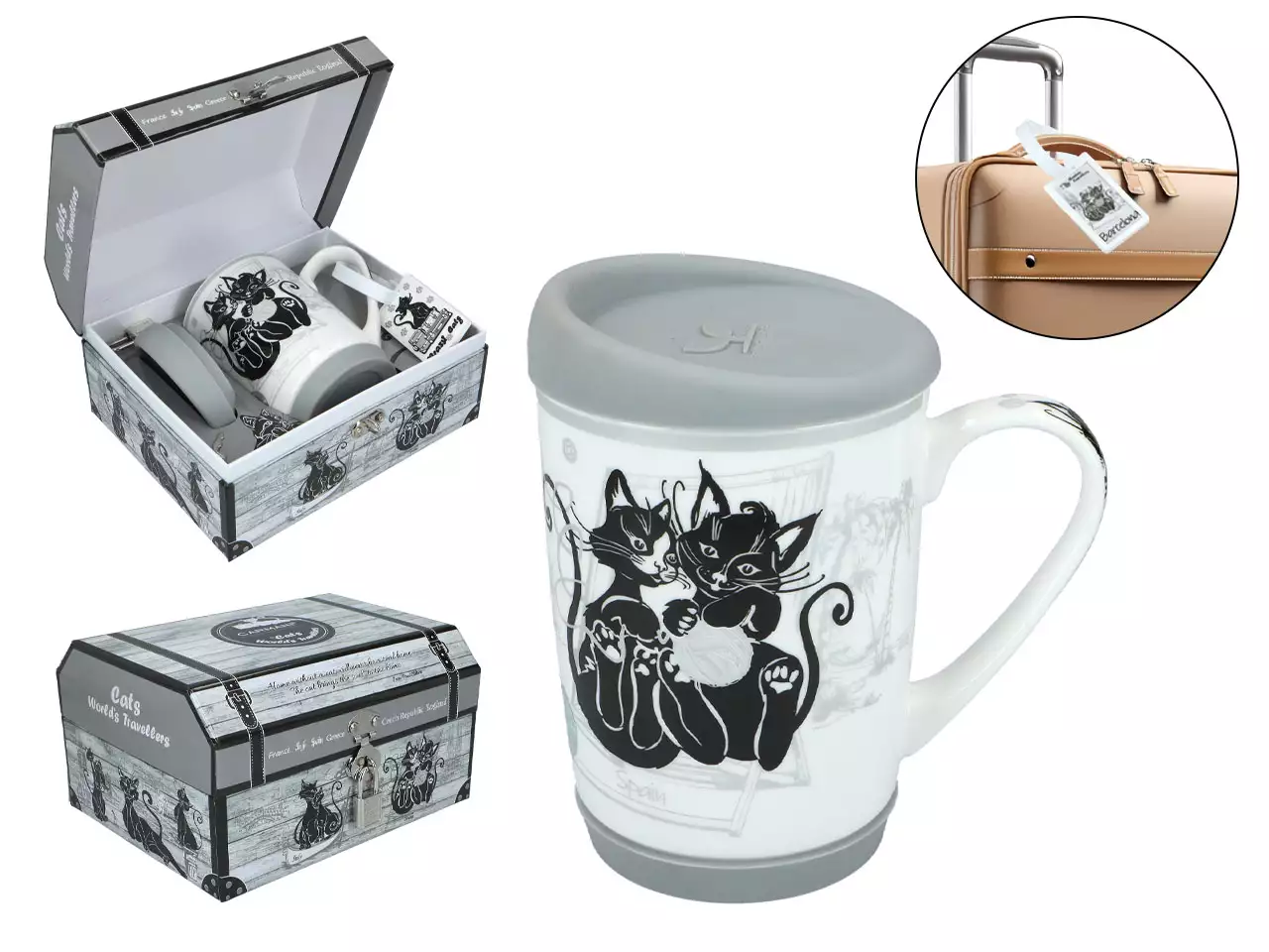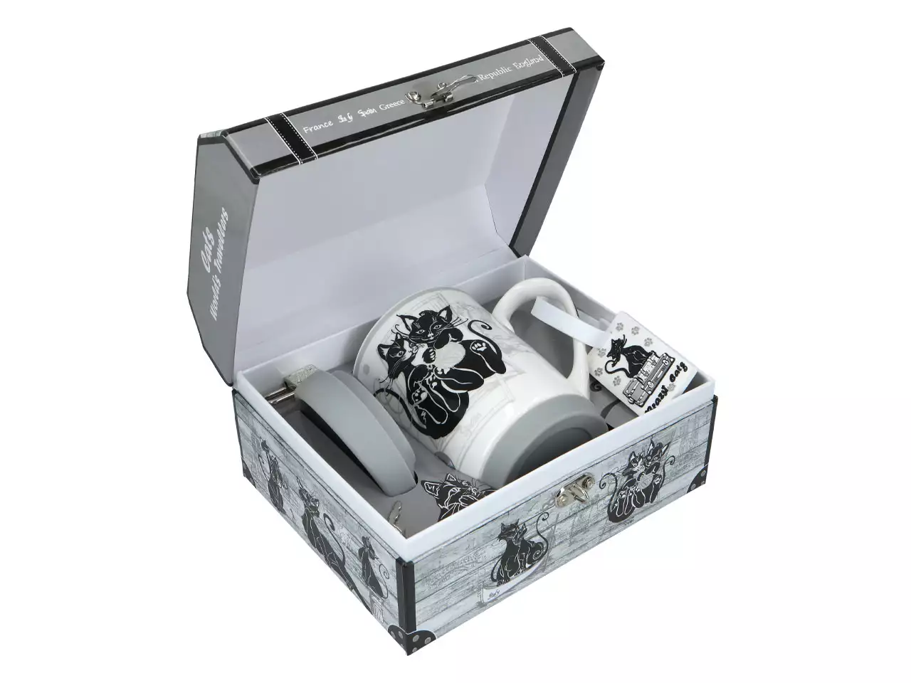 Dodatkowo, do kubka dołączona jest praktyczna przykrywka, która utrzymuje ciepło napoju oraz zapobiega rozlaniu się, a zawieszka do walizki sprawdzi się do wakacyjnych podróży.Całość zapakowana jest w eleganckie ozdobne opakowanie/ kuferek zamykany na kłódeczkę kluczykiem, idealne do podarowania jako prezent dla miłośnika kotów.