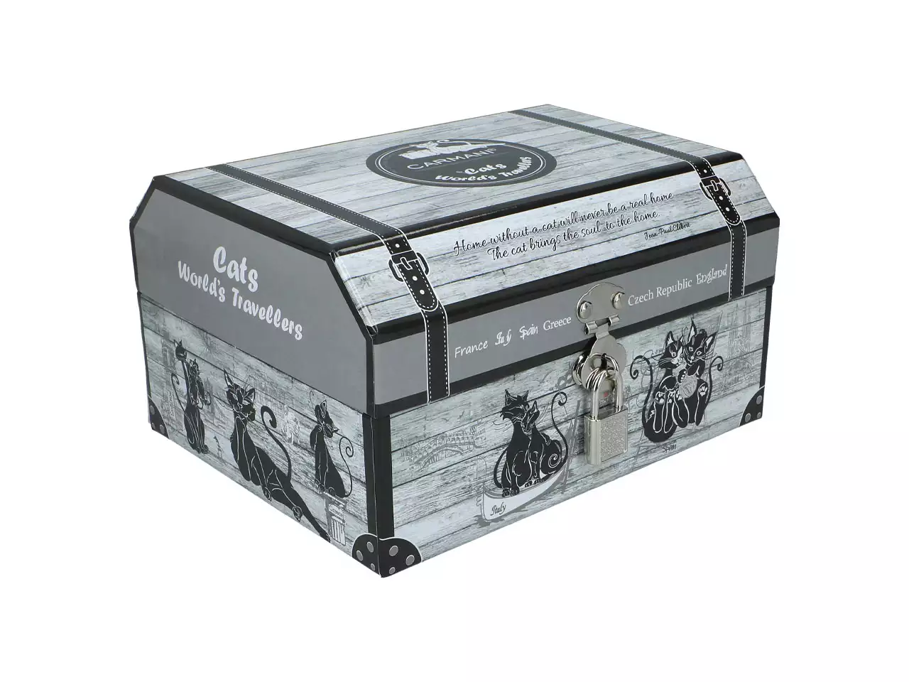 Dodatkowo, do kubka dołączona jest praktyczna przykrywka, która utrzymuje ciepło napoju oraz zapobiega rozlaniu się, a zawieszka do walizki sprawdzi się do wakacyjnych podróży.Całość zapakowana jest w eleganckie ozdobne opakowanie/ kuferek zamykany na kłódeczkę kluczykiem, idealne do podarowania jako prezent dla miłośnika kotów.