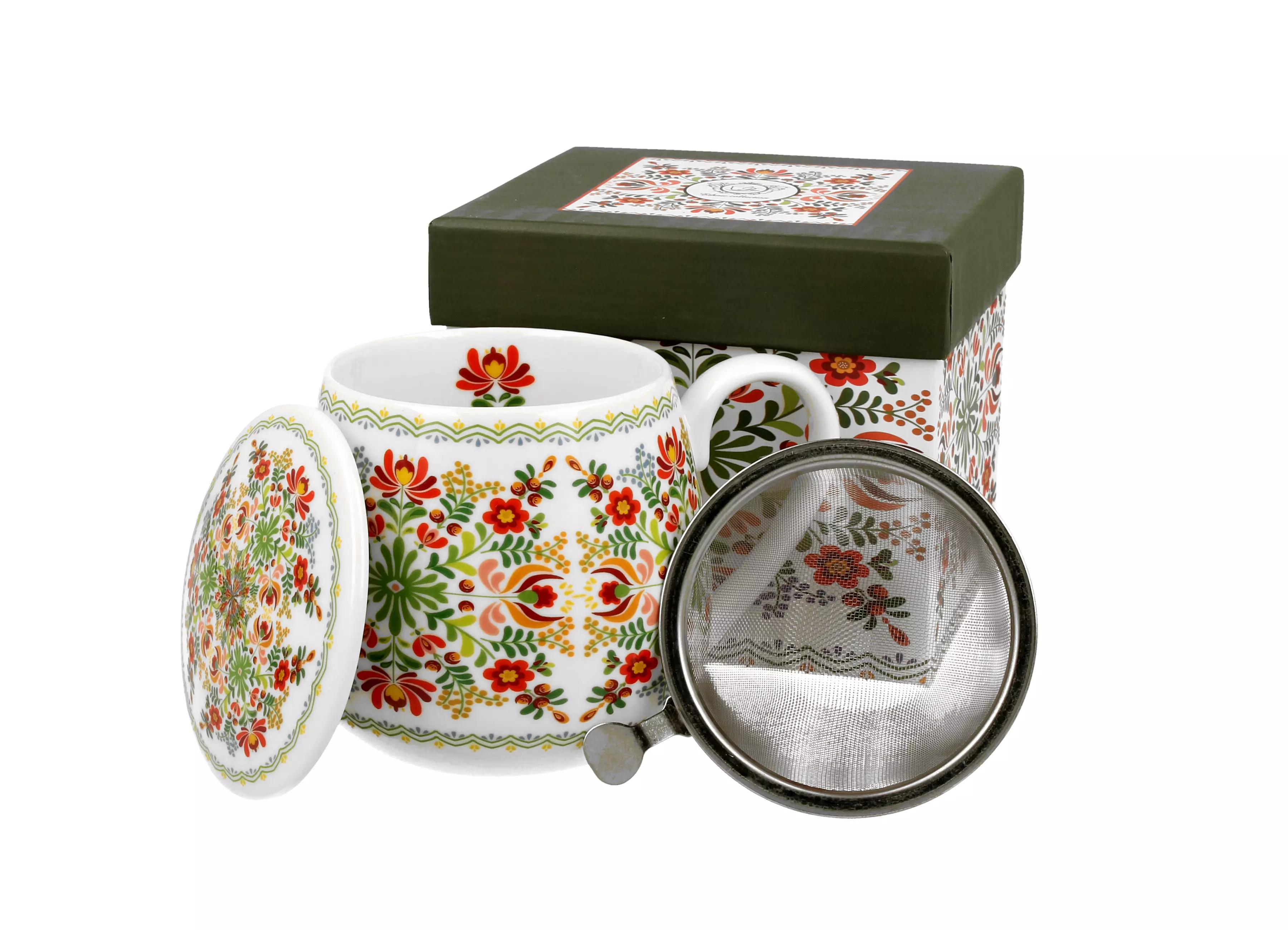 Kubek o kształcie baryłki z sitkiem (zaparzaczem). Praktyczny i wygodny do pracy i w domu do herbaty i ziół. Linia zdobiona motywem uroczej sowy wykonanej z etnicznych wycinanek. Intensywne kolory na idealnie białym tle tworzą harmonijną całość.