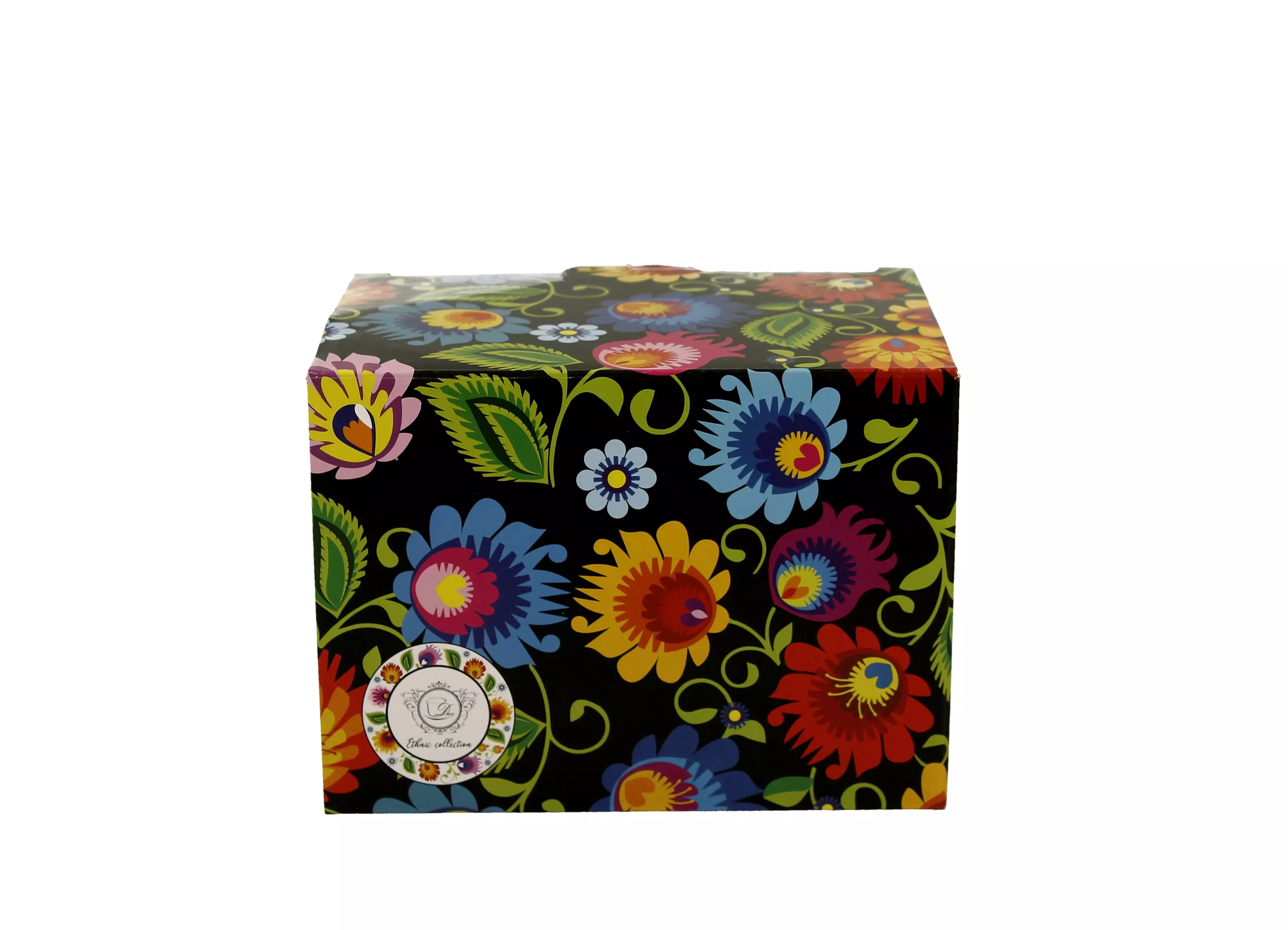 Kubek wykonany z porcelany, linia charakteryzuje się białym kolorem wewnątrz oraz zdobiona regionalnymi, wyrazistymi kolorowymi wycinankami w kształcie kwiatów i pawich oczek na intensywnie czarnym tle. Kubek doskonale nadaje się na grzane wino lub piwo, serwowane w długie jesienne i zimowe wieczory.