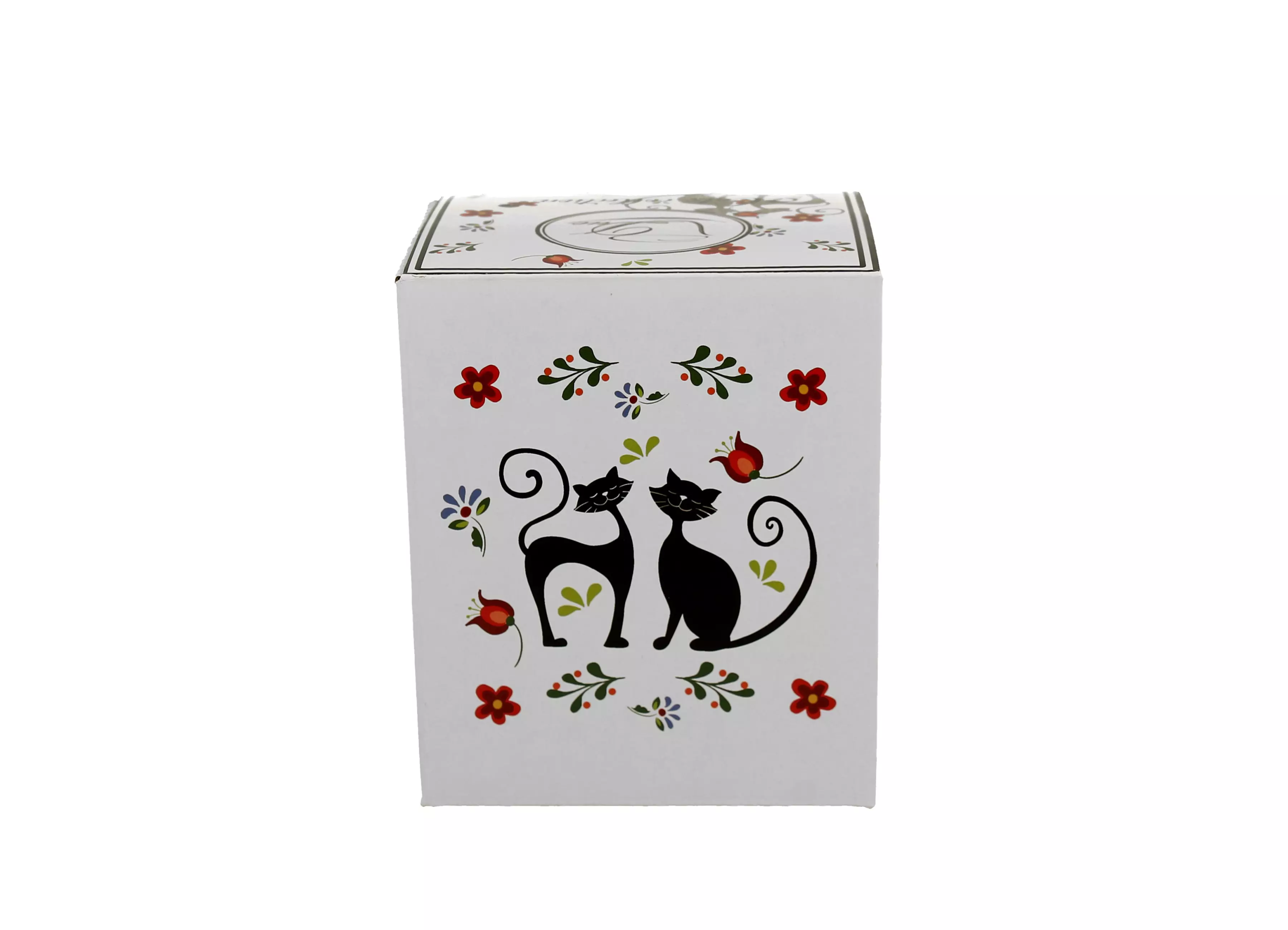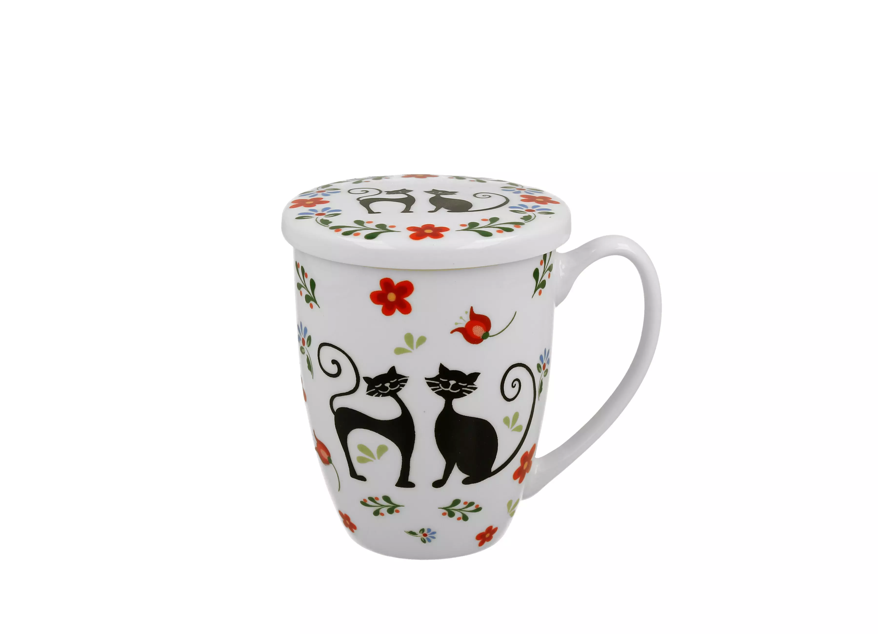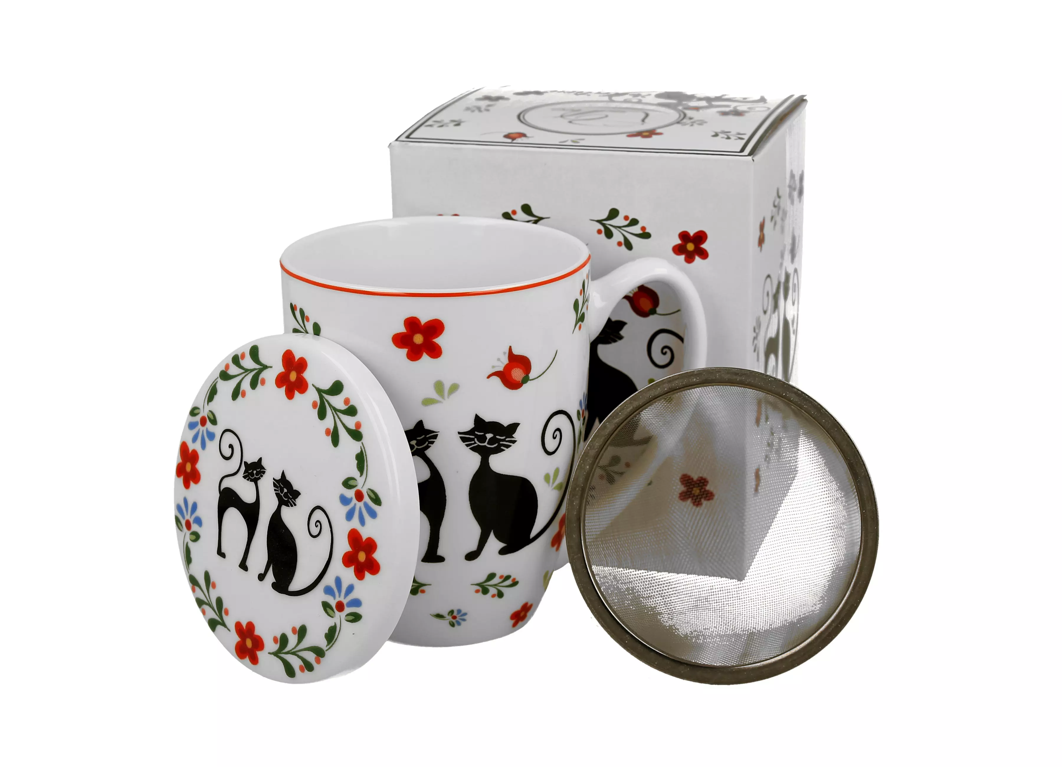 Ciesz się ulubioną herbatą liściastą w kubku z sitkiem. Linia charakteryzuje się zarówno nowoczesnym jak i fantazyjnym designem, a zdobienie motywem figlarnych czarnych kotów na tle malowanych kolorowych kwiatków zadowoli wszystkich miłośników tego zwierzątka.