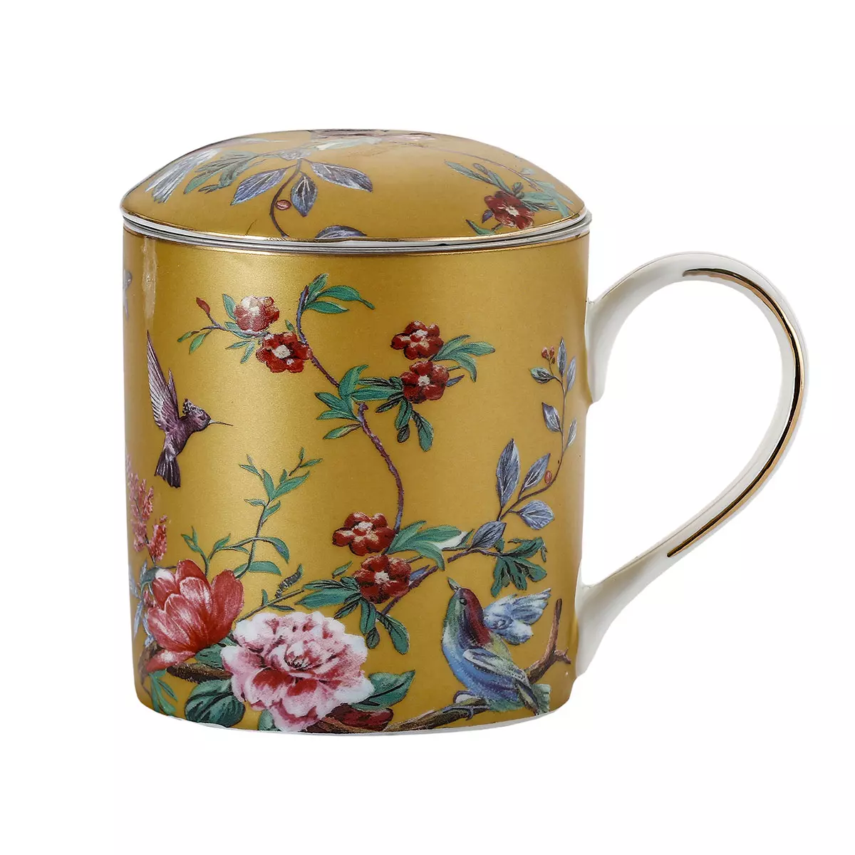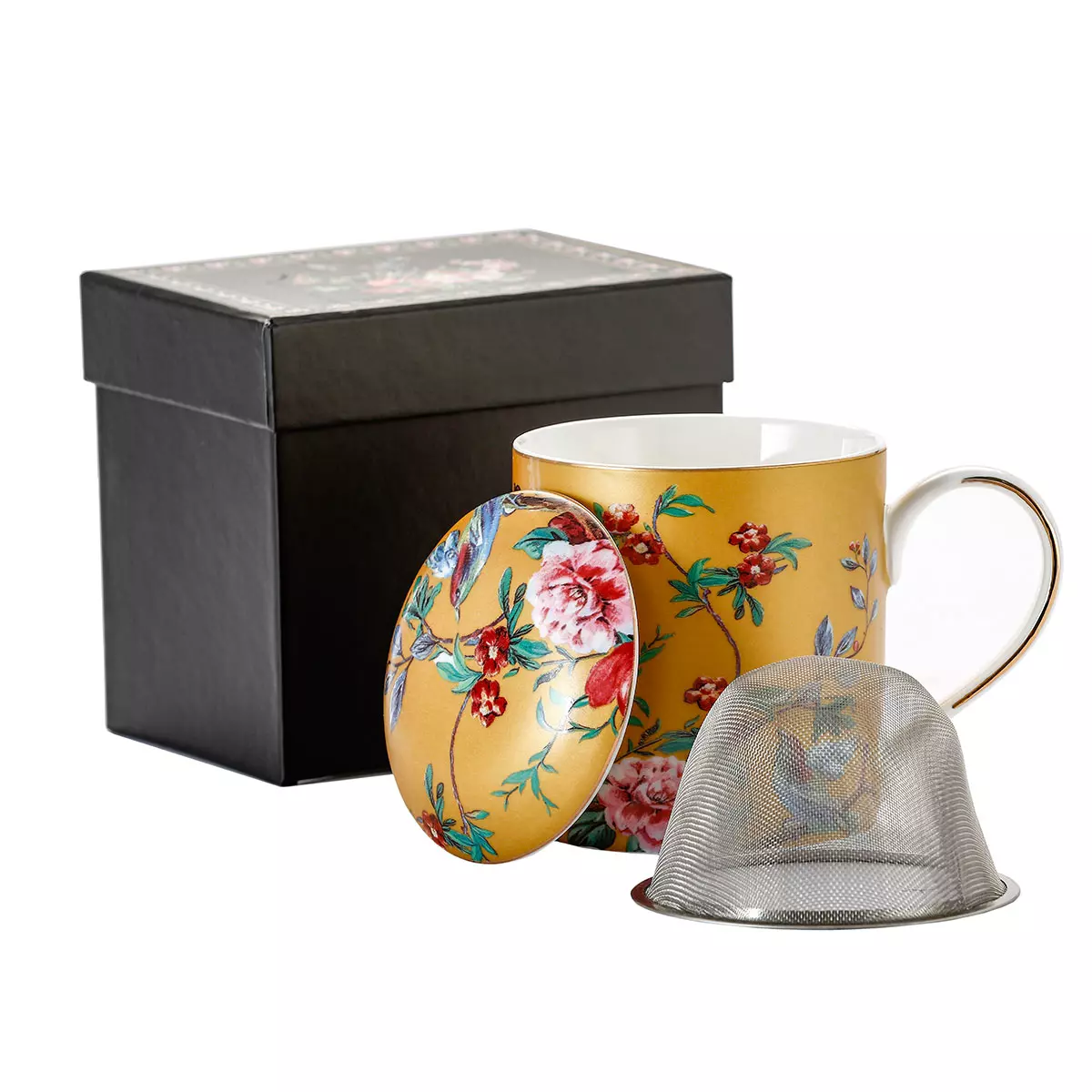 Zestaw zawiera porcelanowy kubek, metalowy zaparzacz oraz porcelanową pokrywkę.