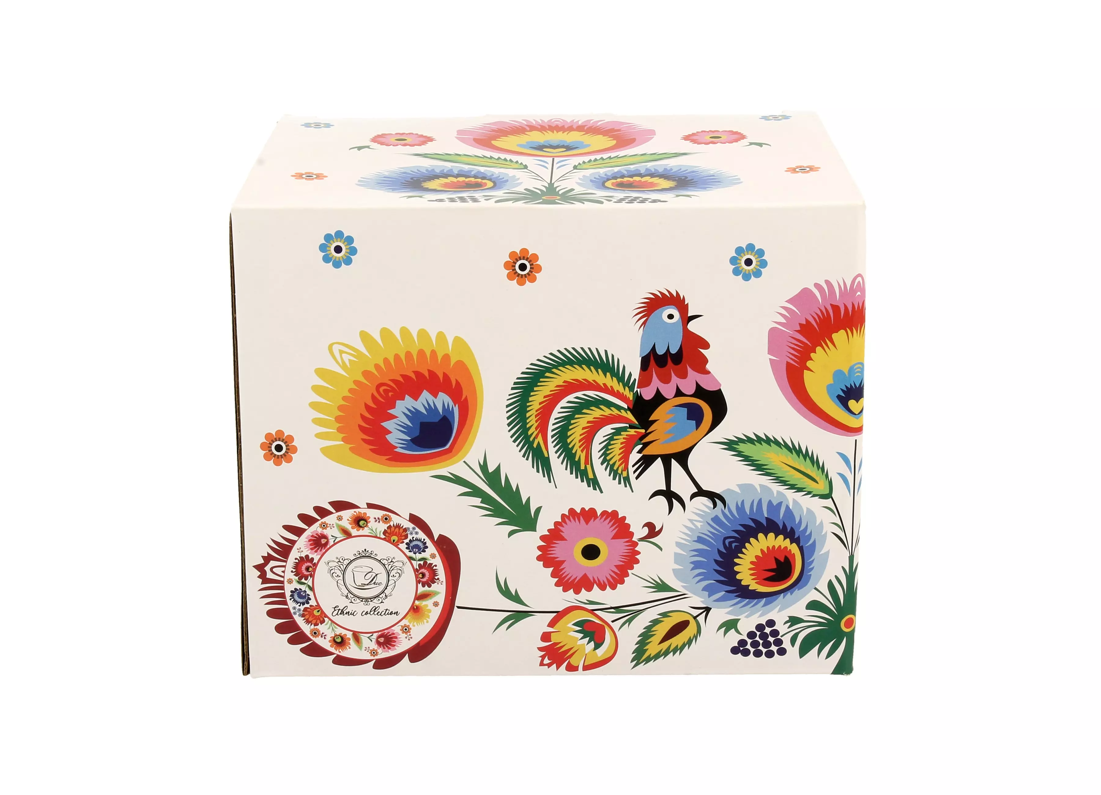 Linia charakteryzuje się wyrazistym, kolorowym motywem tradycyjnych regionalnych wycinanek w kształcie pawich oczek na białym tle.