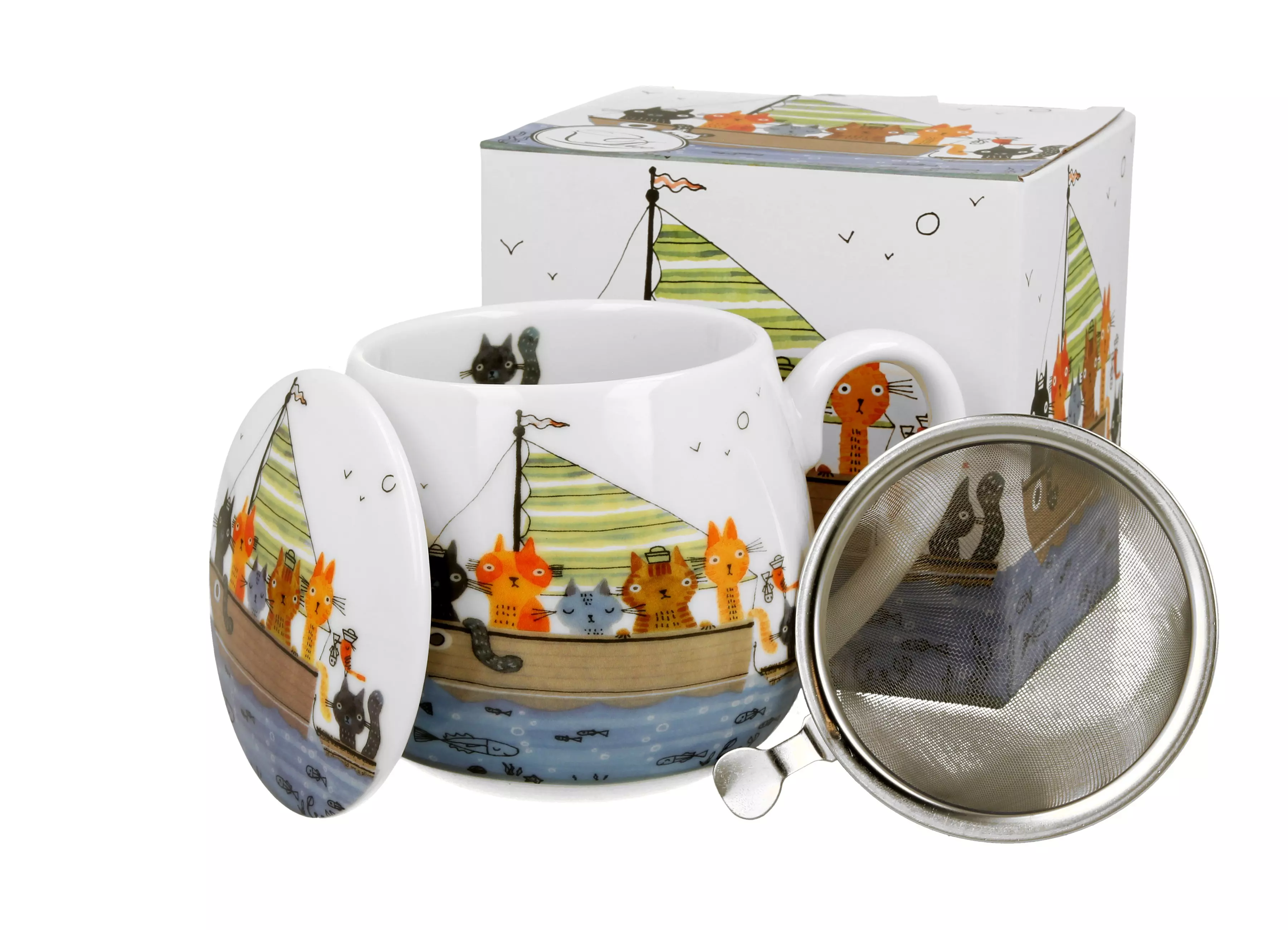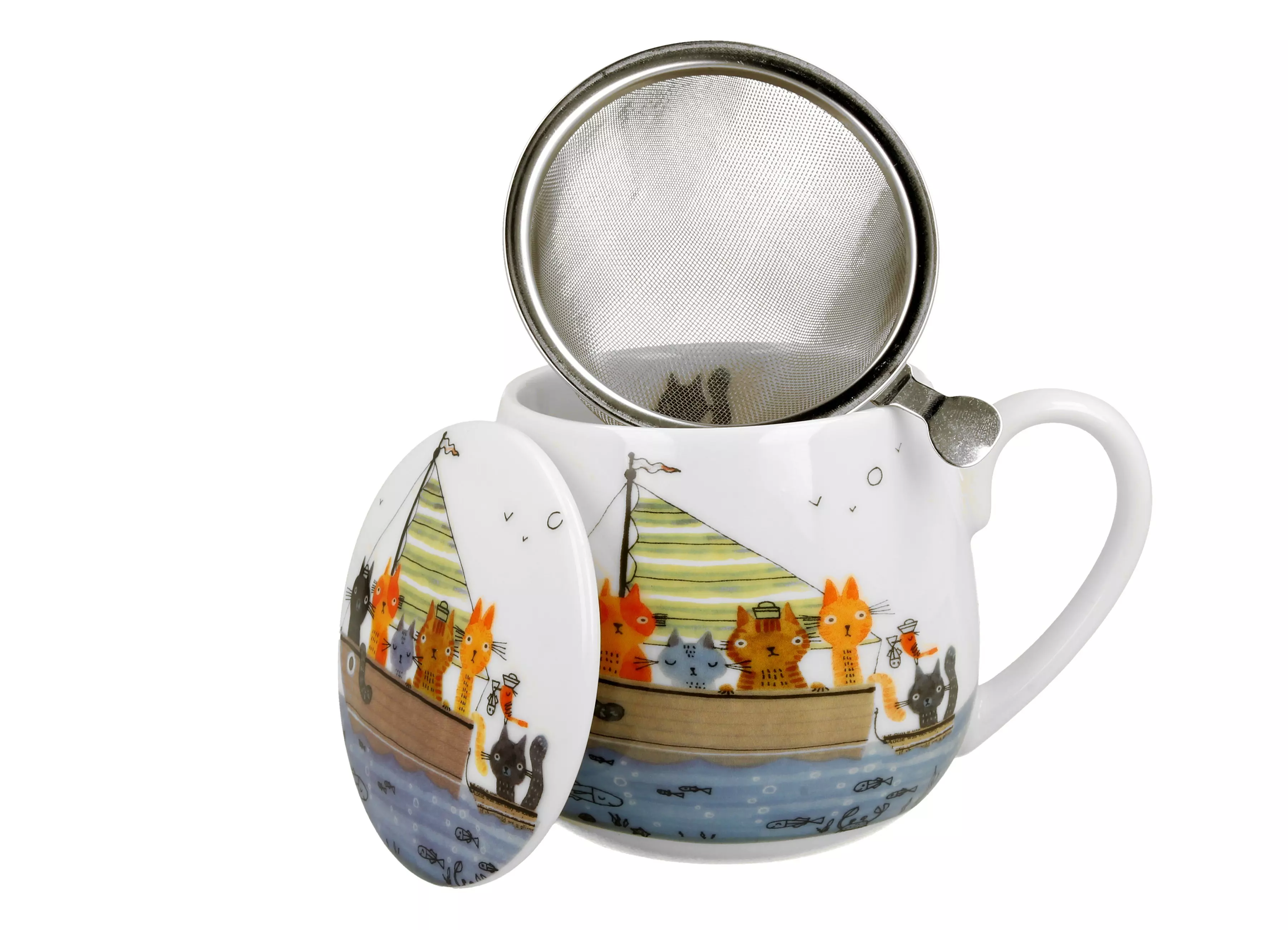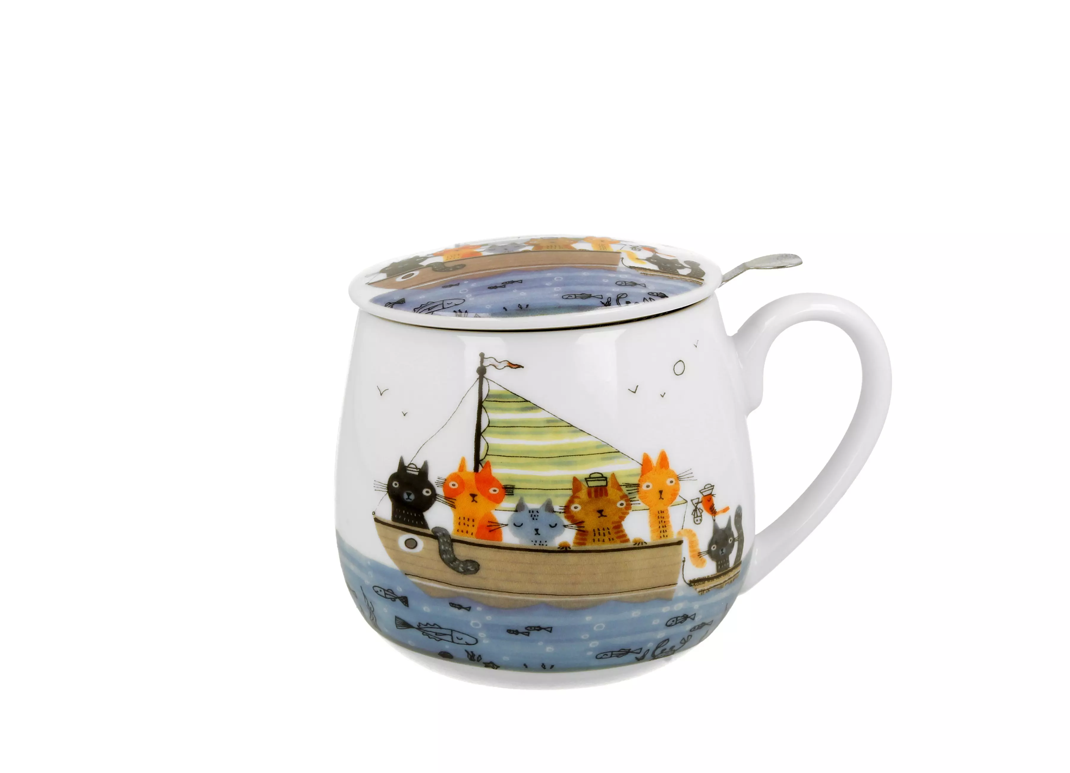 Kubek z sitkiem do parzenia kształt baryłka pojemność 430 ml i pokrywką. Motyw Koci Świat - MARYNARZE wchodzący w skład serii Animals, wykonany z porcelany New Bone China, charakteryzującej się elegancką i naturalną kremowo - białą barwą z delikatnym połyskiem, a także wyjątkową wytrzymałością