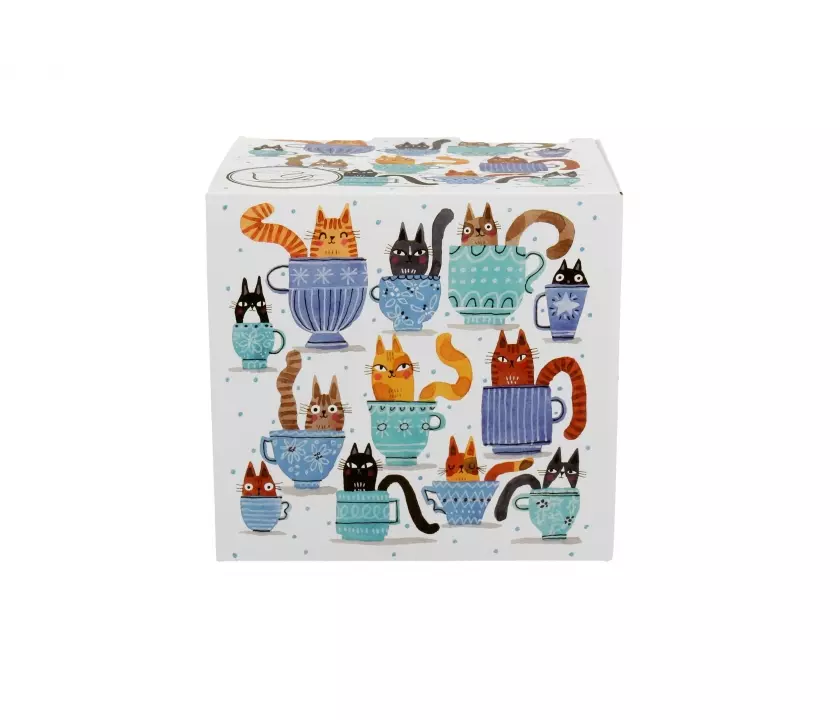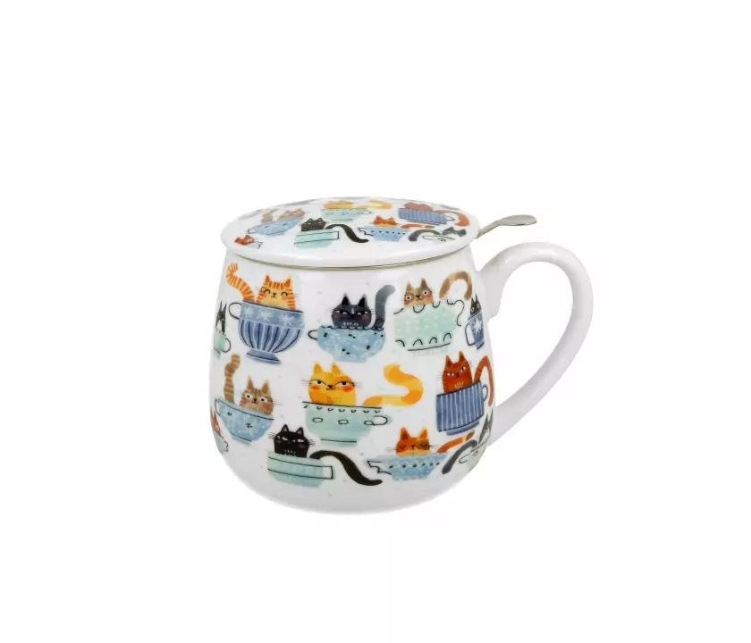 Kubek z sitkiem do parzenia kształt baryłka pojemność 430 ml i pokrywką. Motyw KOTY W FILIŻANCE wchodzący w skład serii Animals, wykonany z porcelany New Bone China, charakteryzującej się elegancką i naturalną kremowo - białą barwą z delikatnym połyskiem, a także wyjątkową wytrzymałością