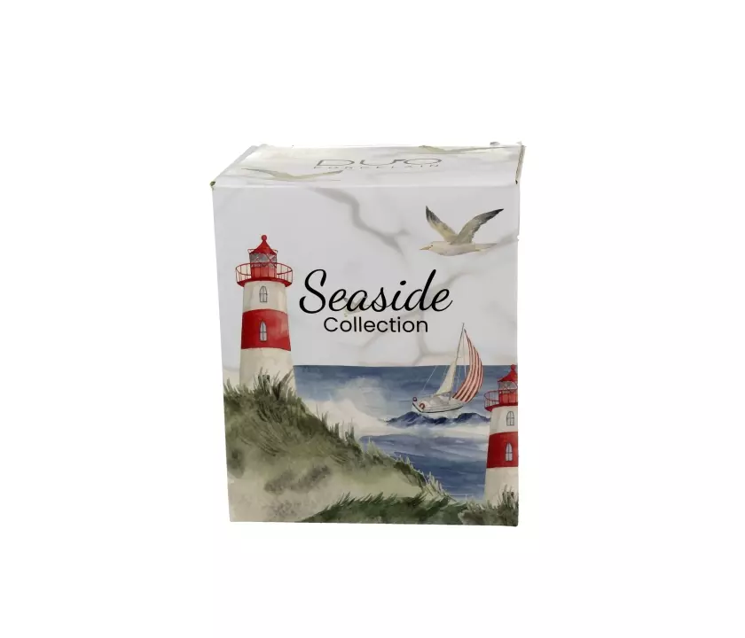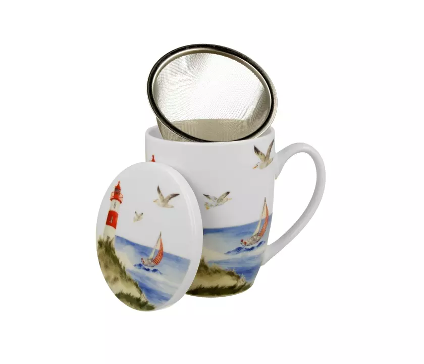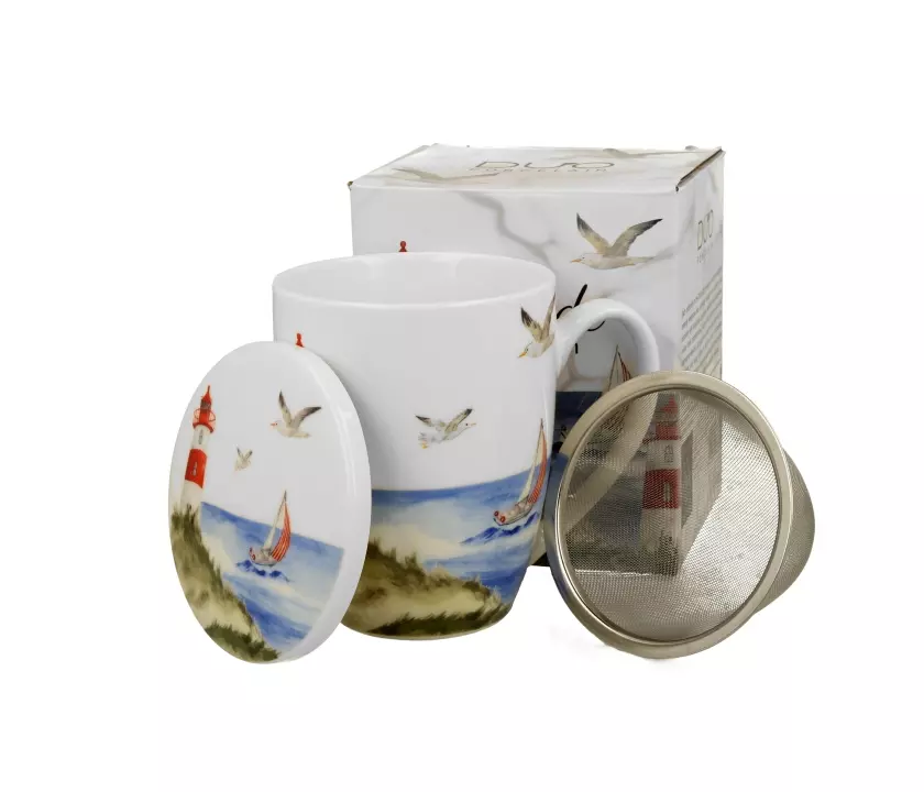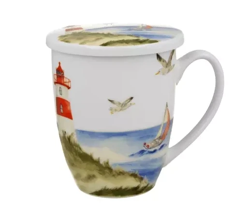 Kubek z sitkiem do parzenia herbaty liściastej motyw LATARNIA MORSKA wchodzący w skład serii Seaside, wykonany z porcelany New Bone China, która charakteryzuje się naturalnym kremowo-białym kolorem z delikatnym połyskiem oraz wyjątkową wytrzymałością i trwałością, zachowując lekkość i finezję.