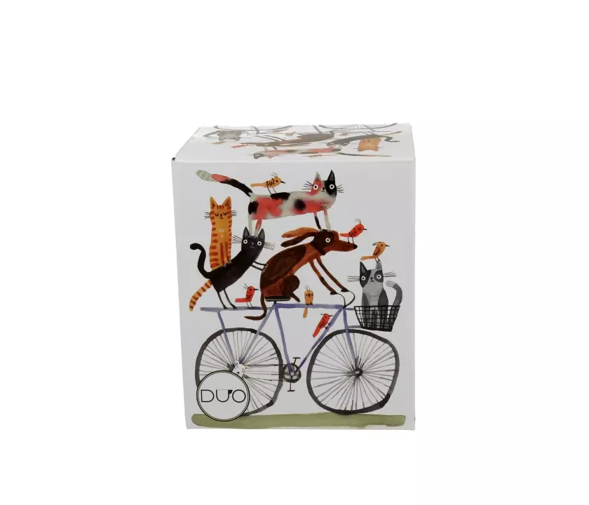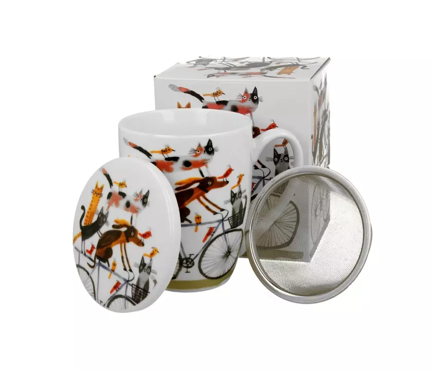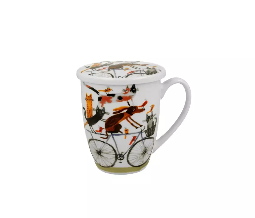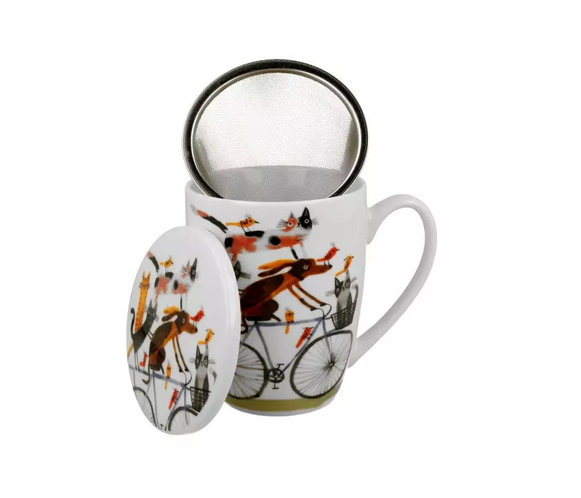 Kubek z zaparzaczem Psi Świat PIES NA ROWERZE wchodzący w skład serii Animals, wykonany z porcelany New Bone China, która charakteryzuje się naturalnym kremowo-białym kolorem z delikatnym połyskiem oraz wyjątkową wytrzymałością i trwałością, zachowując lekkość i finezję.