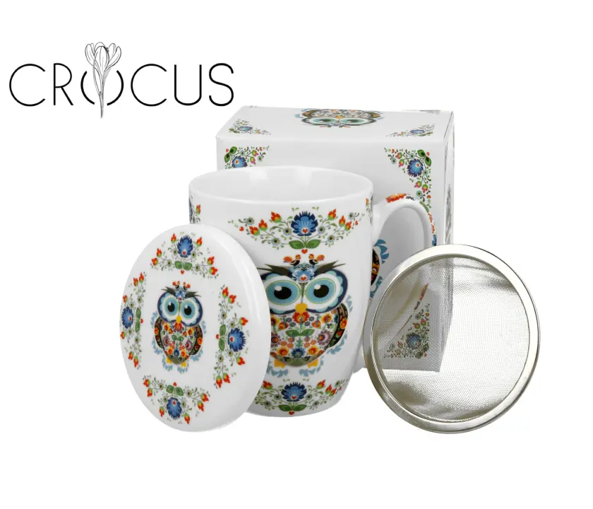 Kubek z zaparzaczem SOWA ETNO wchodzący w skład serii CROCUS, wykonany z porcelany New Bone China, charakteryzującej się elegancką i naturalną kremowo - białą barwą z delikatnym połyskiem, a także wyjątkową wytrzymałością.