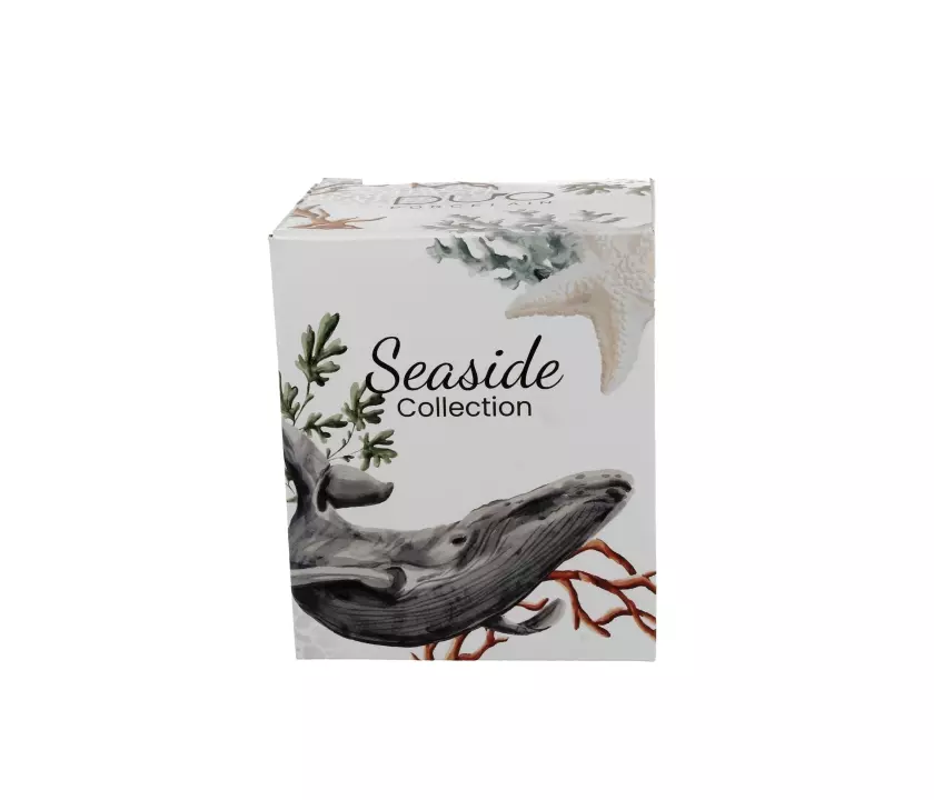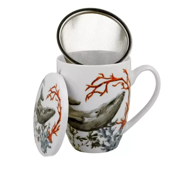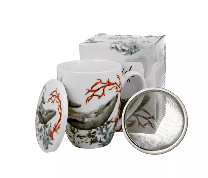 Kubek z zaparzaczem WIELORYB wchodzący w skład serii Seaside, wykonany z porcelany New Bone China, która charakteryzuje się naturalnym kremowo-białym kolorem z delikatnym połyskiem oraz wyjątkową wytrzymałością i trwałością, zachowując lekkość i finezję.