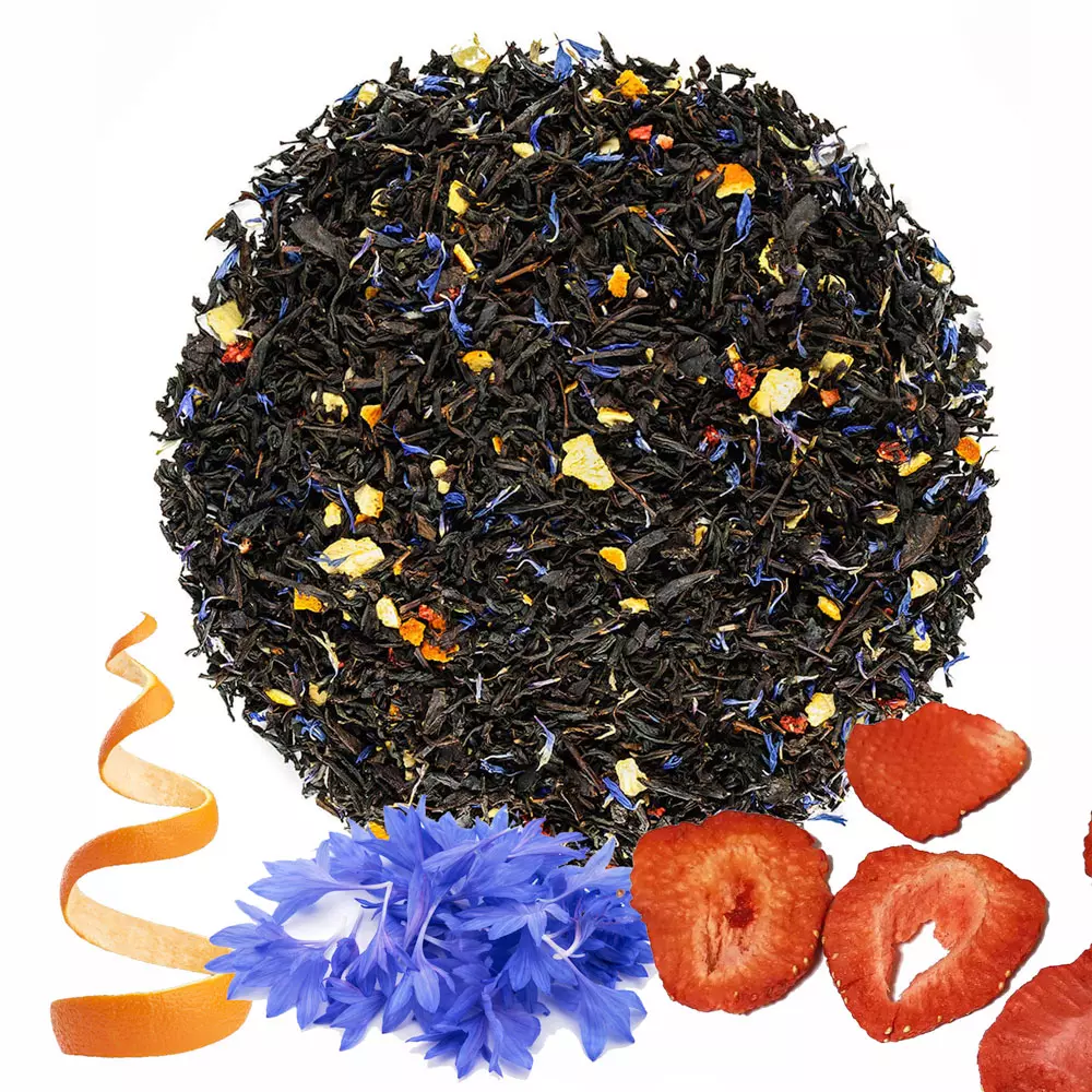 Składniki: herbata czarna OP, skórka pomarańczowa suszona, truskawka liofilizowana, bławatek, aromaty