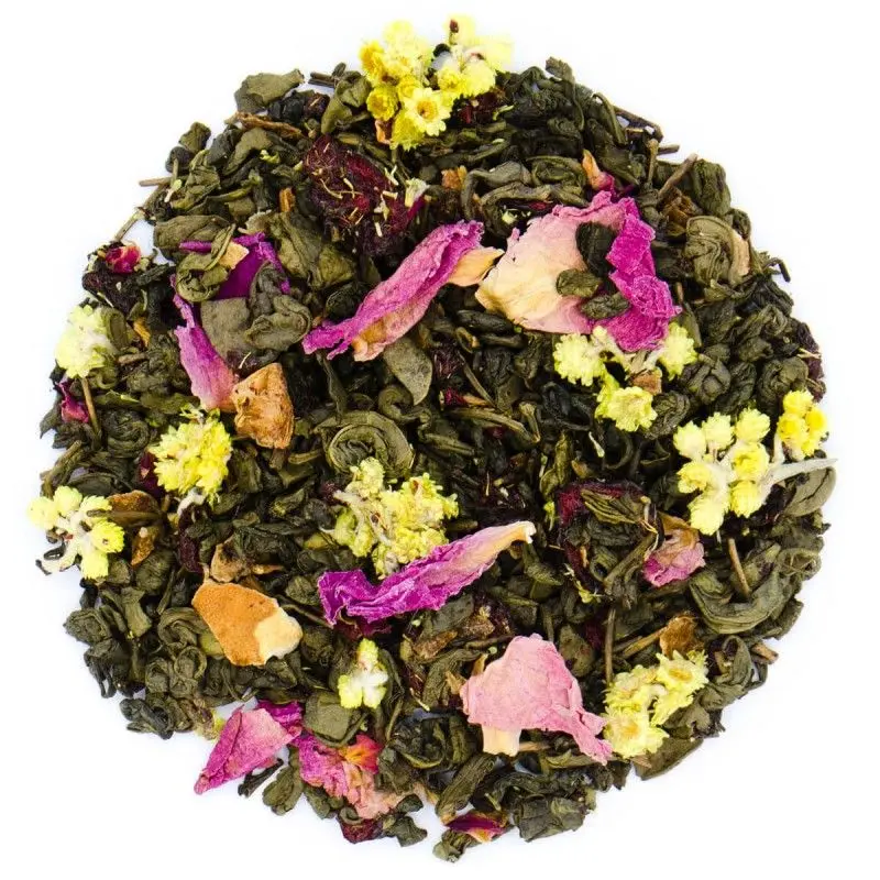 Składniki: herbata zielona Gunpowder, skórka cytrynowa suszona, wiśnia liofilizowana, kwiat kocanki, płatki piwonii, aromaty