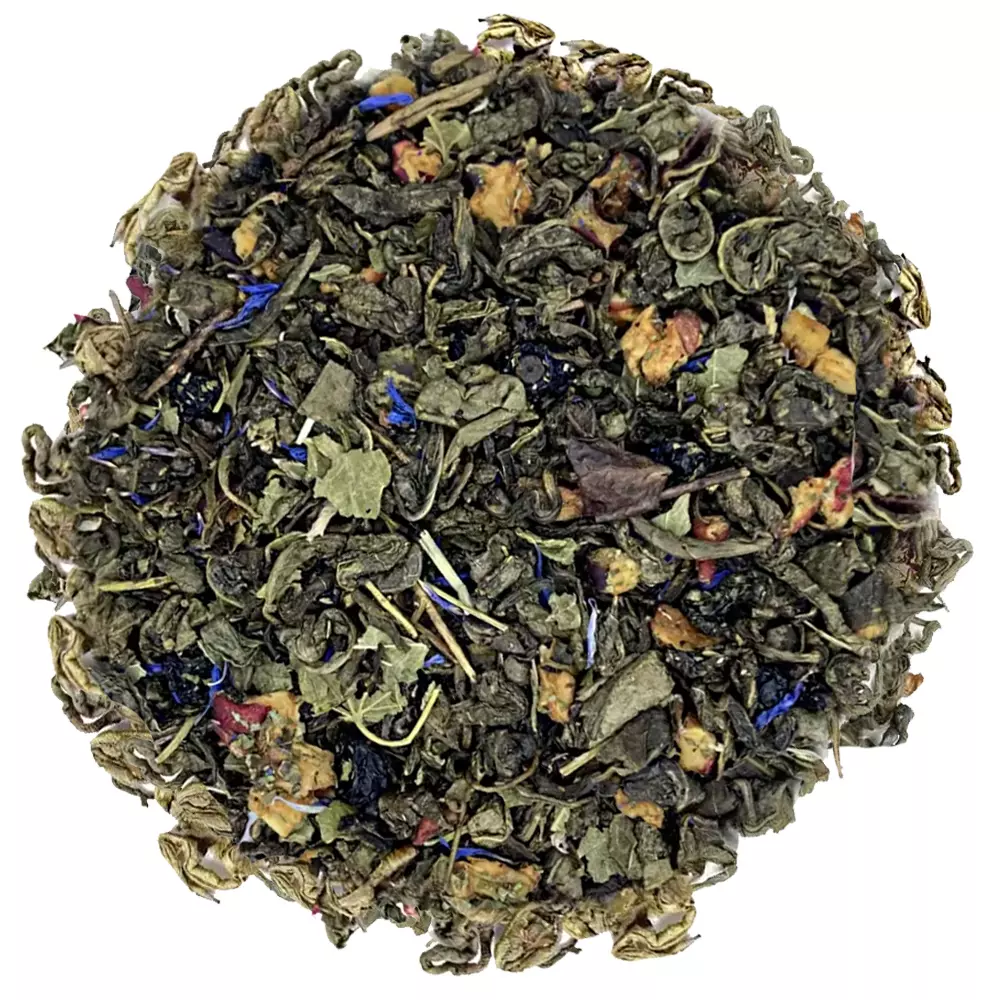 Kompozycja orzeźwiającej zielonej herbaty Gunpowder z dodatkiem skórki pomarańczowej, trawy cytrynowej oraz imbiru i bazylii.