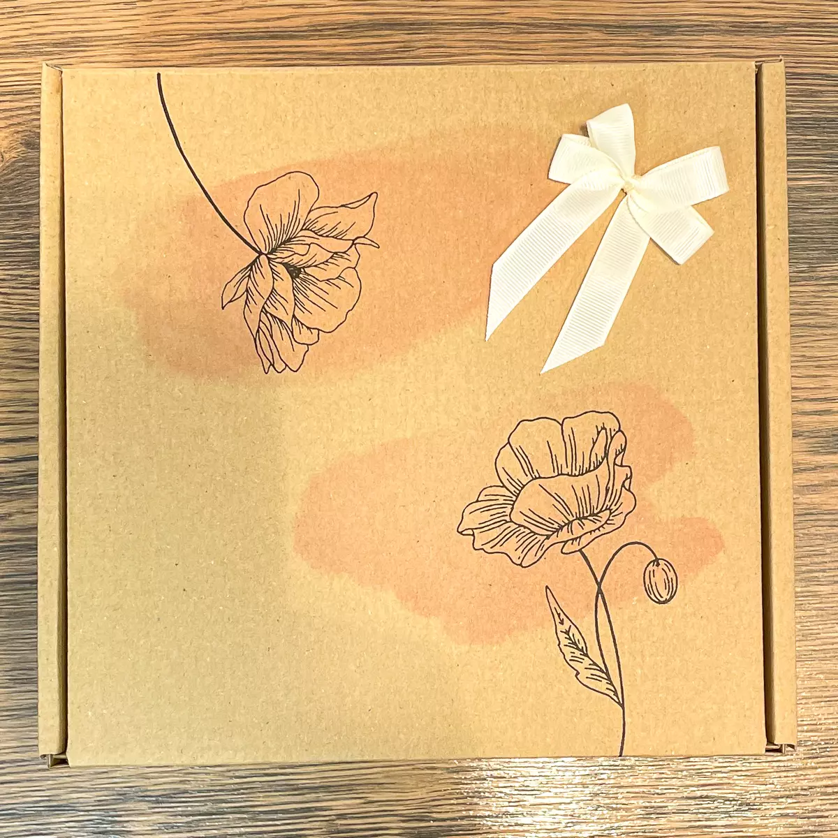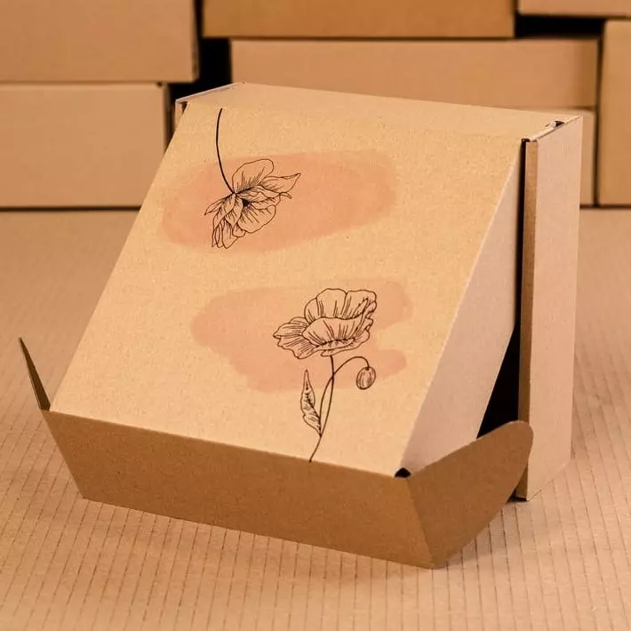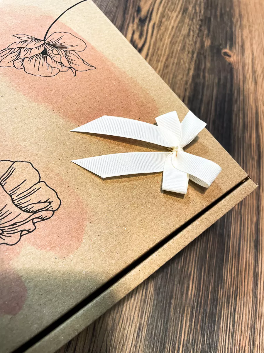 - Pudełko karton zamykany z nadrukiem - "Zmalowane kwiaty" na wierzchu umieszczona ręcznie wykonana kokarda.