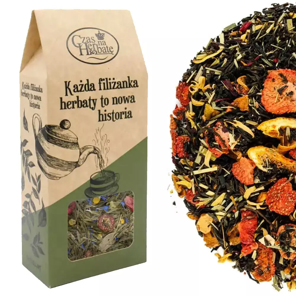 Kolorowa i wyjątkowo aromatyczna kompozycja. Plasterki truskawek i pomarańczy oraz cząsteczki jabłka górują na tle słomkowej trawy cytrynowej i kwiatem hibiskusa. Całość jako napar herbaty tworzy bardzo orzeźwiający napar, który doskonale smakuje na ciepło, a także na zimno z kostkami lodu oraz kawałkami świeżych owoców.