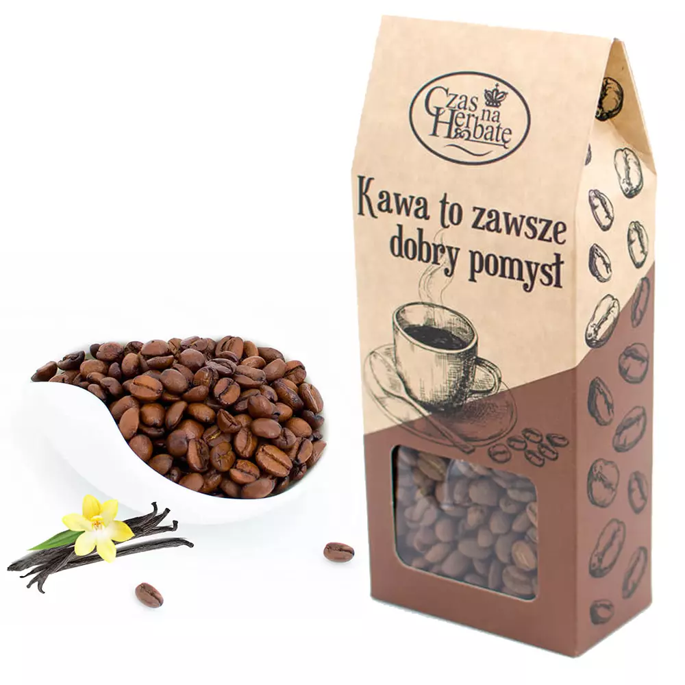 KAWA O SMAKU WANILIOWYM 50g - w kartoniku prezentowym z okienkiem w którym widoczne ziarenka kawy napisem "Kawa to zawsze dobry pomysł" (Kawa w ziarnach)