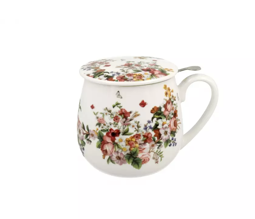 Kubek w kształcie baryłki 430 ml z zaparzaczem VINTAGE FLOWERS WHITE wchodzący w skład serii Duo Classic, wykonany z porcelany New Bone China, charakteryzującej się elegancką i naturalną kremowo - białą barwą z delikatnym połyskiem, a także wyjątkową wytrzymałością.