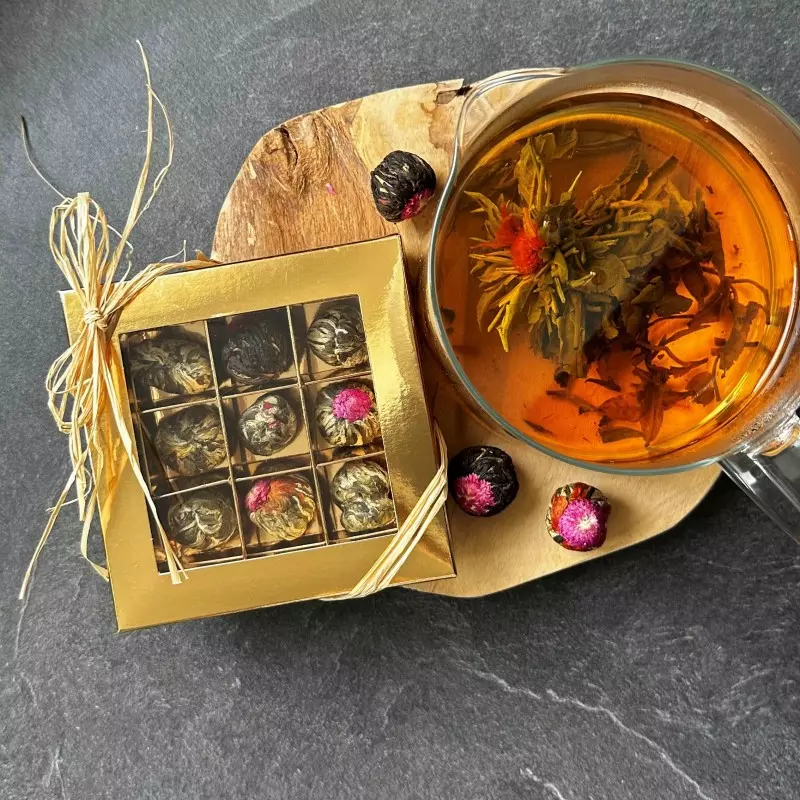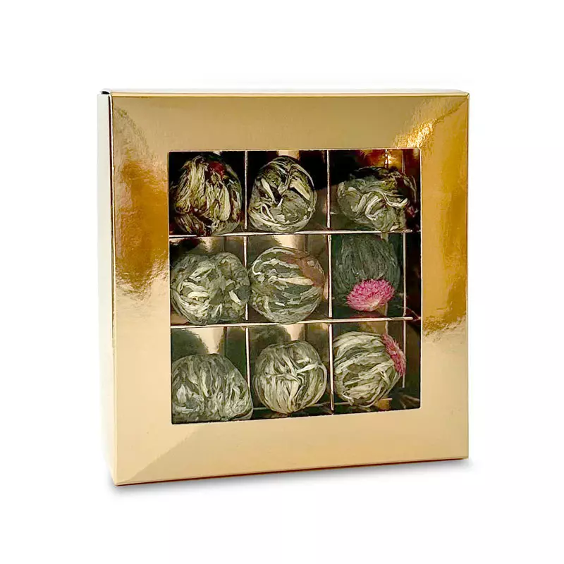 Herbaty kwitnące to wyjątkowe produkty, który wymagają pięknej oprawy. Prezent na każdą okazję zarówno dla kobiet, jak i mężczyzn w różnym wieku, a także wspaniały dodatek do innych produktów. Bombonierka z herbatami kwitnącymi to błyszczący, złoty, atrakcyjny design, różnorodność - aż 9 różnych kwiatów w środku, kompaktowe opakowanie i wspaniały, wyjątkowy prezent.